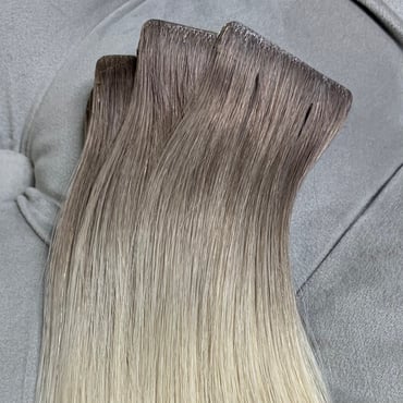 Invisible Tape Extensions. Haare bis zum Tape Ansatz mit Haaren beknüpft.. Für ein Optimales Unsichtbares Ergebnis.